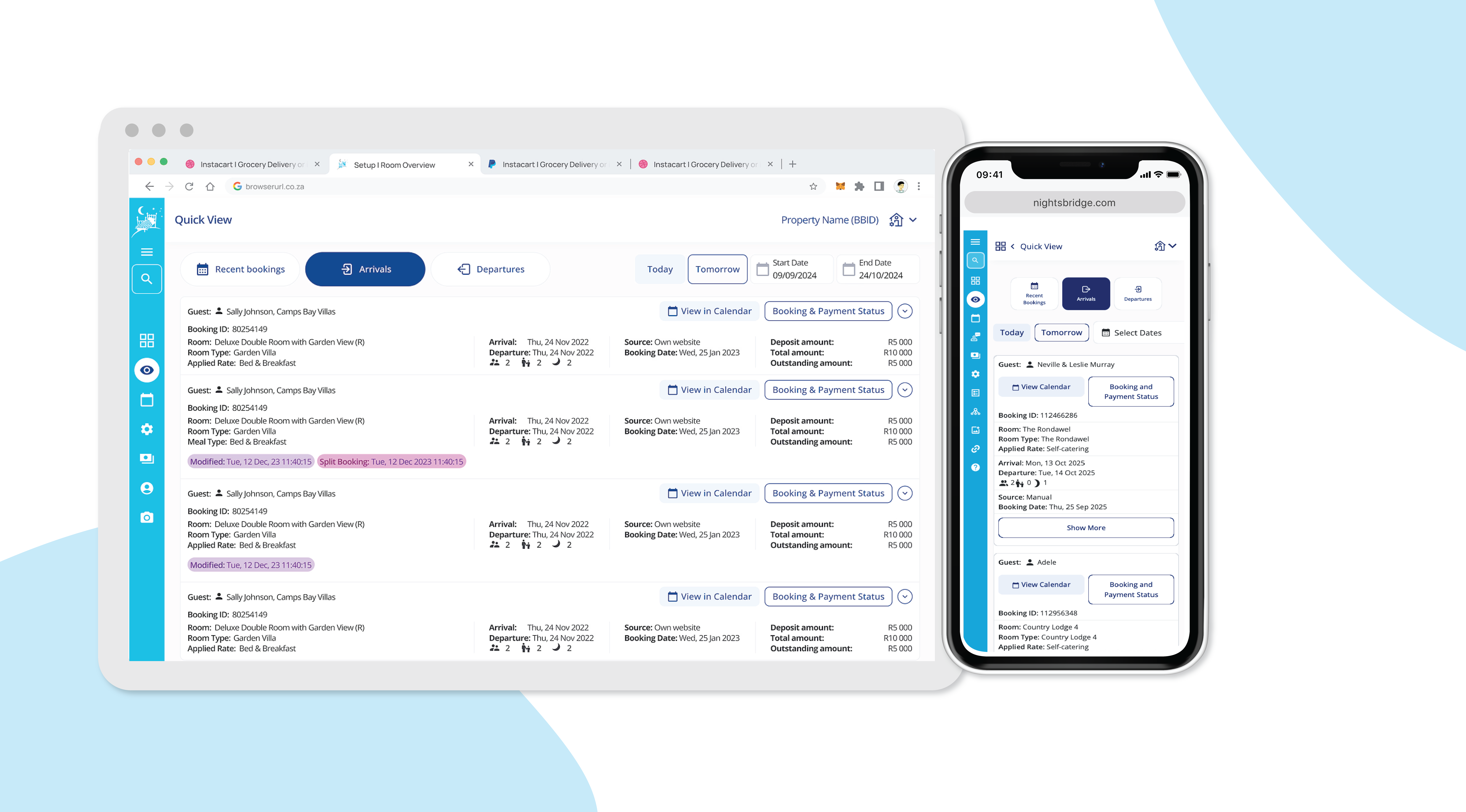 A quick and mobile-friendly way to get to where you need to be in NightsBridge. We grouped all our powerful features together in one place to make it easier than ever to find and use the tools you need. Additional shortcuts in the side-menu guide you to certain areas faster, with Quick View helping you to easily action your daily booking tasks.
