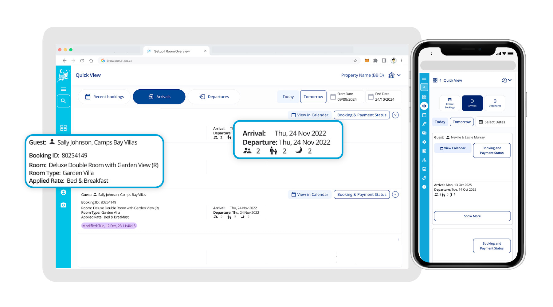 A quick and mobile-friendly way to get to where you need to be in NightsBridge. We grouped all our powerful features together in one place to make it easier than ever to find and use the tools you need. Additional shortcuts in the side-menu guide you to certain areas faster, with Quick View helping you to easily action your daily booking tasks.
