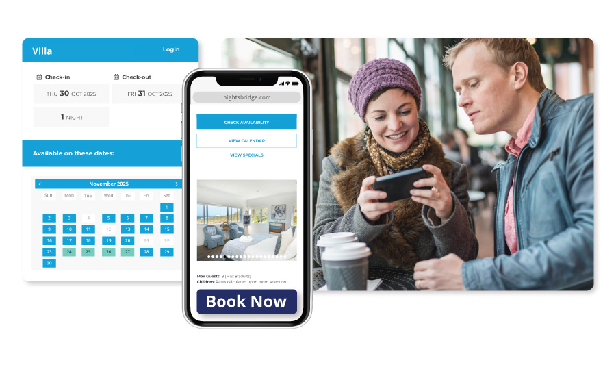 With NightsBridge, the booking engine is branded to your property but runs on our technology. It pulls availability and rates from your NightsBridge calendar or your PMS. Once a guest confirms the booking, it goes straight back into your central system so you don’t have to capture it twice.