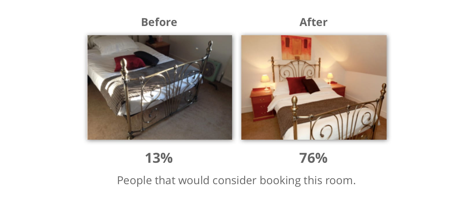 In an experiment people were shown before and after photographs of the same room, and asked which they would book. The results showed that small improvements made a big difference in the booking decision: 63% more people would book the room on the right than the one on the left.